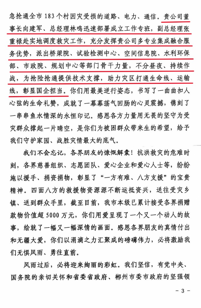 信中指出,資興市此次遭遇災(zāi)情極為罕見,多地基礎(chǔ)設(shè)施遭到嚴(yán)重損毀、大范圍交通中斷,當(dāng)?shù)厝嗣?/span>生產(chǎn)生活遭受嚴(yán)重影響。在關(guān)鍵時刻,湖南交通設(shè)計(jì)院黨委高度重視、響應(yīng)號召、極速支援,在黨委書記、董事長向建軍,黨委副書記、副董事長、總經(jīng)理林鳴的部署下,迅速成立救災(zāi)重建工作專班,派出司屬橋梁院、試驗(yàn)檢測中心、空間信息院、水利環(huán)保部、市政院、規(guī)劃中心、市場中心等單位包括教授級高工在內(nèi)的技術(shù)骨干力量,抽調(diào)設(shè)備物資,全力投入。黨委委員、副總經(jīng)理張重祿赴一線實(shí)地調(diào)度,黨委委員、副總經(jīng)理、總工程師李瑜全過程督導(dǎo)。公司上下協(xié)同作戰(zhàn),以實(shí)際行動貢獻(xiàn)國企力量,彰顯國企擔(dān)當(dāng)。